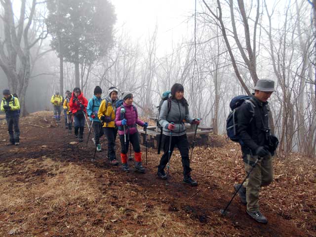 登山を開始し暫く歩くと、やはりしっかりと着込んでいた受講生は熱くてたまらなくなり、衣服調整をして登山を再開。展望の悪い中、歩き続け牧寄山に到着。ここでランチタイムとなる。話しもはずみ皆の心が和む食事を終え、大羽根山に向け出発。