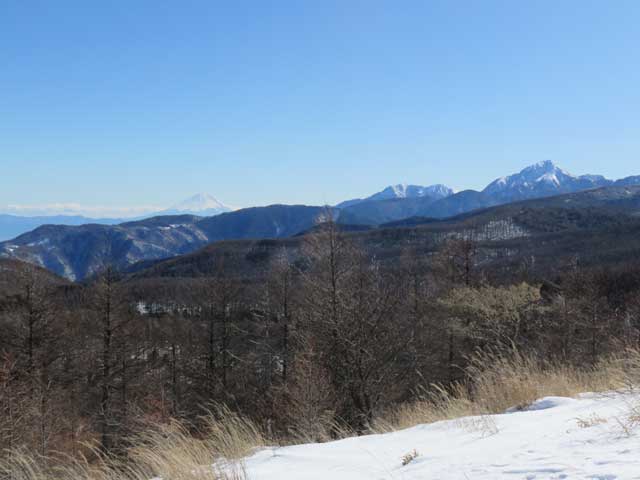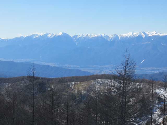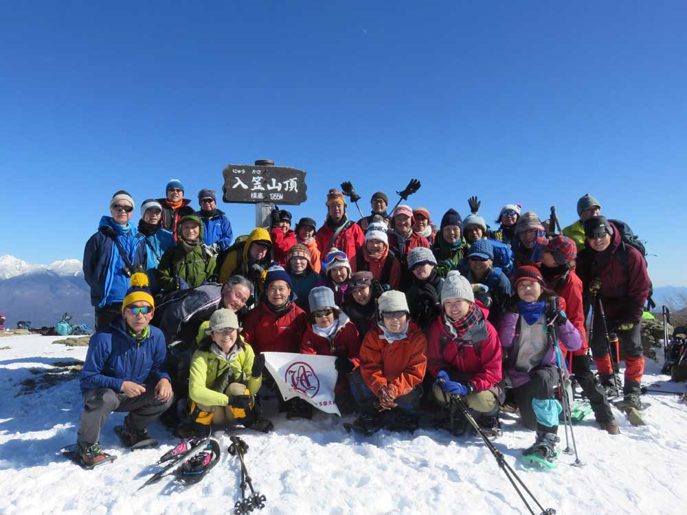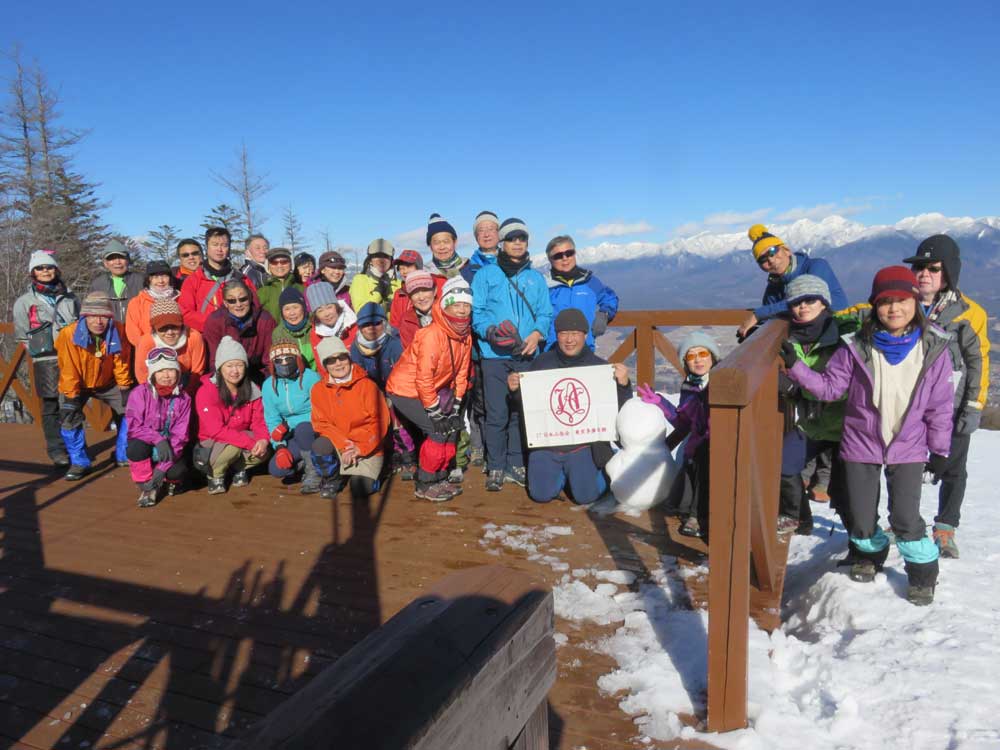 雪が少ないためスノーシューでない登山者もいる。御所平で一休みし、本格的な登りにかかる。途中からスノーシューのヒールリフターを上げ登りに対応する。これにより登りが楽になった実感を味わってもらう。最後の急登を上がると広い入笠山の頂上に出る。360°の展望に歓声があがる。今日は風も弱いので頂上で展望を楽しみながら昼食を摂る。中央アルプス、甲斐駒ケ岳、富士山、奥秩父、八ヶ岳の展望を欲しいままにする。