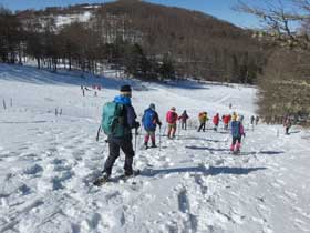 展望を楽しんだ後は急な下山路を慎重に下る。途中から右手の雪面にスノーシューを生かした楽しい下りを選択する。思い思い好きな斜面を下ってもらう。みんな歓声を上げながらスノーシューを楽しんでいる。誰も踏み込んでいない雪面を自分だけが歩くことが、こんなにも楽しいことかと思う。入笠湿原を横切り最後はアンテナ塔への登りを頑張ってゴンドラ山頂駅に到着する。ここでも八ヶ岳をバックに集合写真を撮る。帰りのバス内では、スノーシューは多くの受講生から楽しかったと声が上がる。登山の楽しさの幅を広げられたと思う。後は、3月の登山教室修了登山「雲取山」を残すのみとなり、それまでの登山教室集大成となる準備をお願いした。