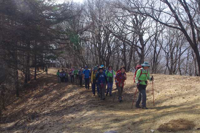 100m上げて分岐点からはプロムナードのような緩い尾根歩き。東西に長くて広い山頂にたくさんの登山者が(100人はいたのでないか)休んでいるが、桜はまだ。集合写真の後200mほど急降下があり、片手は空けてシングルストックでと指示が出る。