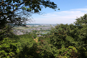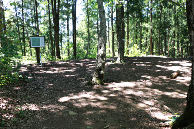小広い山頂には城の遺構図と由縁が書かれた解説板が立ち、すぐそばに三等三角点が半分埋もれた状態でたたずんでいる。樹木が育ったせいか冬枯れの時期以外は展望はあまりよくないが、平坦な地勢はここに山城があったことを色濃く伝えている。