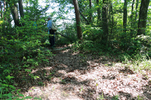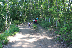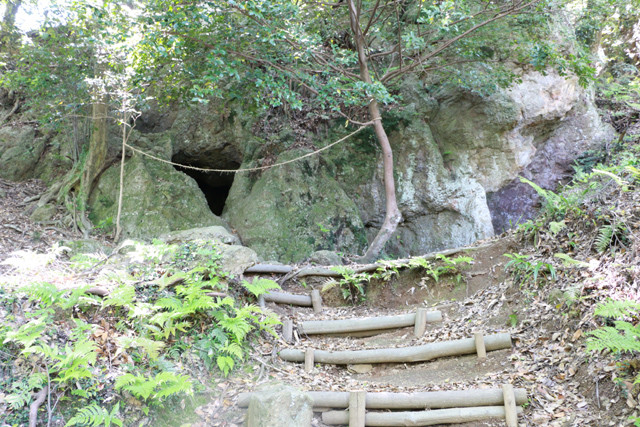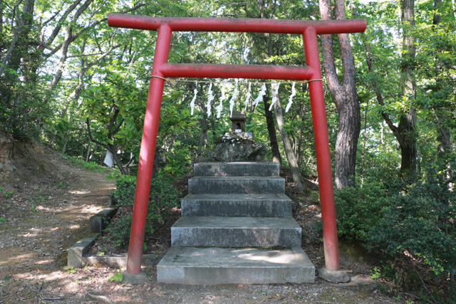 自然歩道に戻り、道なりにどんどん東の方へ行く。作業道が何カ所も交差しているので要注意だ。とにかく広い道を選んでいけばよい。登山道の左側奥には、日照山(240m)、破風山(210m)があるが、到達は困難でお勧めできない。広場風の箇所を3カ所ほど過ぎると道は狭くなり山道になる。左に小神社を見て、少し先で尾根道に上がる。左側が切れ落ちた細い道を行くので十分注意して歩く。