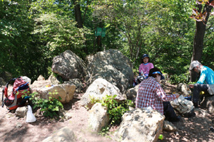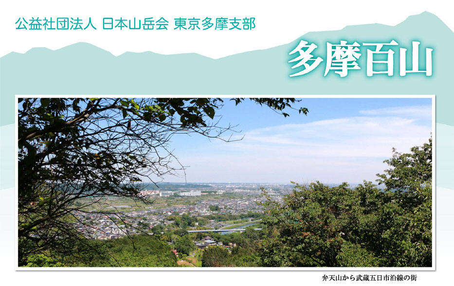 小休止の後は南東側に下り、網代弁天山(292m)に向かう。途中で山腹を見ると掘割の跡などが見える。この後、急下降の丸太階段を下り、山腹を巻く道を行くと、間もなく網代弁天山の直下に出る。短いがかなり急な道を登ると網代弁天山に着く。岩がゴロゴロしている狭い山頂だ、周りにはミツバツツジやヤマザクラが多く、4月上旬から中旬にかけて赤紫色や薄紅色に包まれる。多摩の山々ではもっともきれいな花の山のひとつである。展望もまた素晴らしい。食事でもしながらゆっくりしたいところだ。